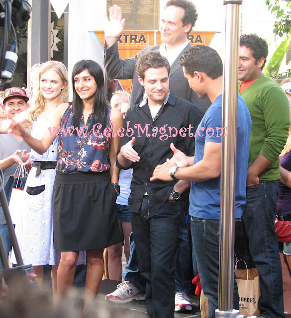 The cast of NBC’s newest comedy, Outsourced, Ben Rappaport (Todd Dempsy), Diedrich Bader (Charlie Davis, also OfficeSpace, Napoleon Dynamite), Parvesh Cheena (Gupta, also Barbershop), Pippa Black (Tonya, also Neighbours), and Rebecca Hazlewood (Asha, also Doctors), was at The Grove today, bringing gag gifts for Mario Lopez, host of Extra.