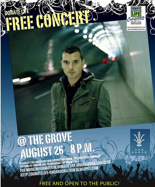 Donate Life Organ & Tissue Donation Weblog: DONATE LIFE CONCERT SERIES @ THE GROVE AUGUST 26, 2009 FEATURING GAVIN ROSSDALETHE ENTIRE CONCERT IS FREE so just come early to the Grove, enjoy the shops and restaurants and then the concert which starts at 8 PM. .