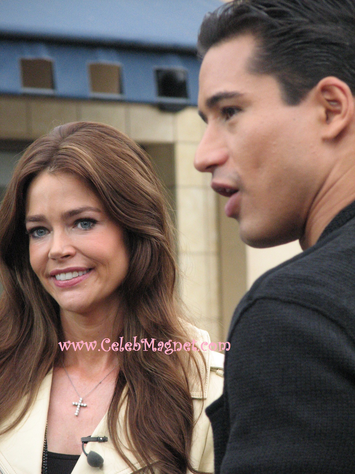 Right before the latest saga taking place in New York this weekend with her ex-husband Charlie Sheen, Denise Richards came to The Grove to speak with Mario Lopez of Extra to promote her new role on Spike TV’s Blue Mountain State. And she surprised Mario and the crowd with her brand new look as a brunette.