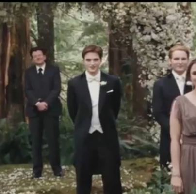 You can see Edward Cullen (Robert Pattinson) in his wedding Tuxedo as he watches Bella Swan (Kirsten Stewart) walk down the aisle in her wedding dress.