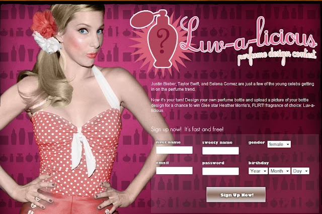 Design your own perfume bottle and upload a picture of your bottle design for a chance to win Glee star Heather Morris, FLIRT! fragrance of choice: Luv-a-licious.