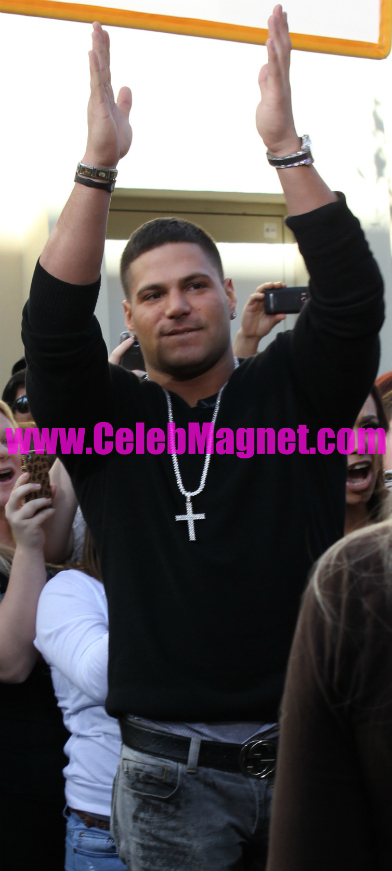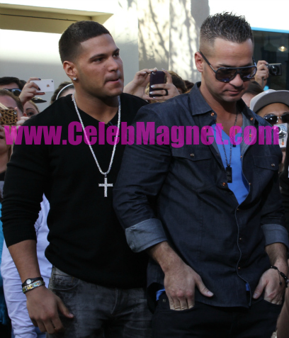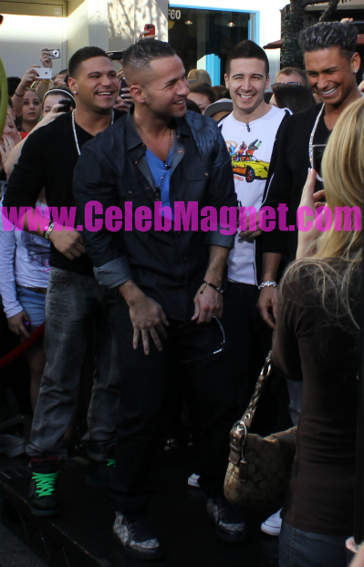 SPOTTED: The men of Jersey Shore (Mike ‘The Situation’ Sorrentino, Ronnie Margo, Pauly D and Vinny Guadagnino) at The Grove in Los Angeles for an interview with Mario Lopez of Extra.