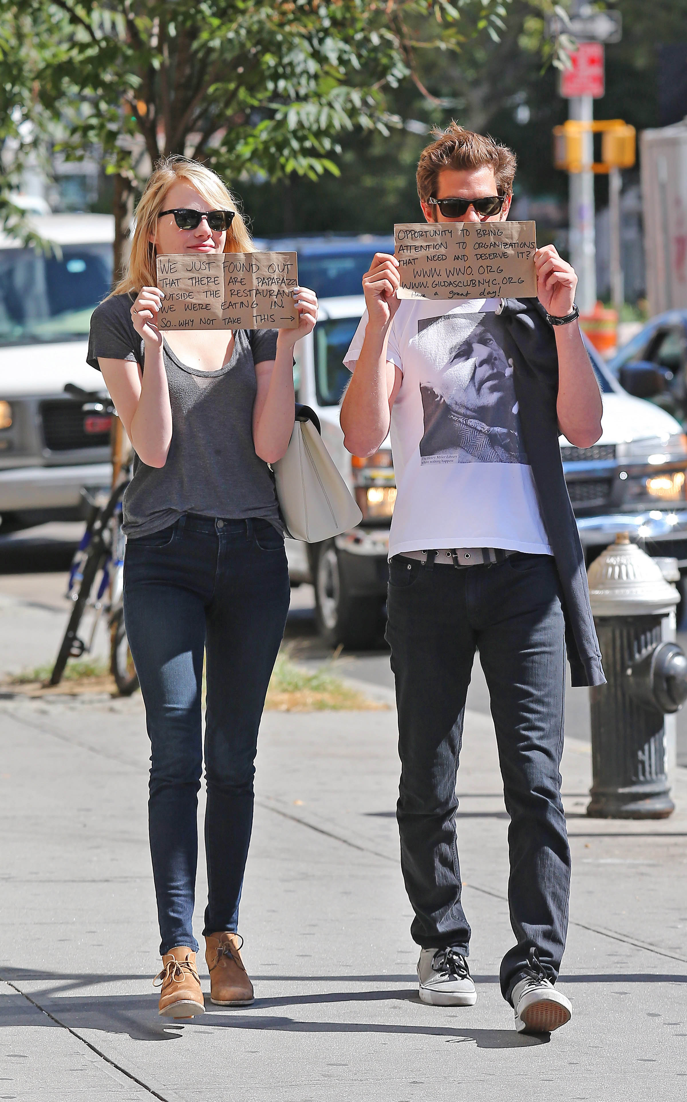 Couple Emma Stone and Andrew Garfield using their celebrity status to draw attention to a good cause after leaving lunch in New York City, New York on September 15, 2012. Emma was holding up a sign that read “We just found out that there are paparazzi outside the restaurant we were eating in, So why no take this…” and Andrew’s sign read “Opportunity to bring attention to organizations that need and deserve it? www.wwo.org and www.gildsclub.org, Have A Great Day!” The two websites they were promoting are Worldwide Orphans Foundation and cancer help at Gilda’s Club.