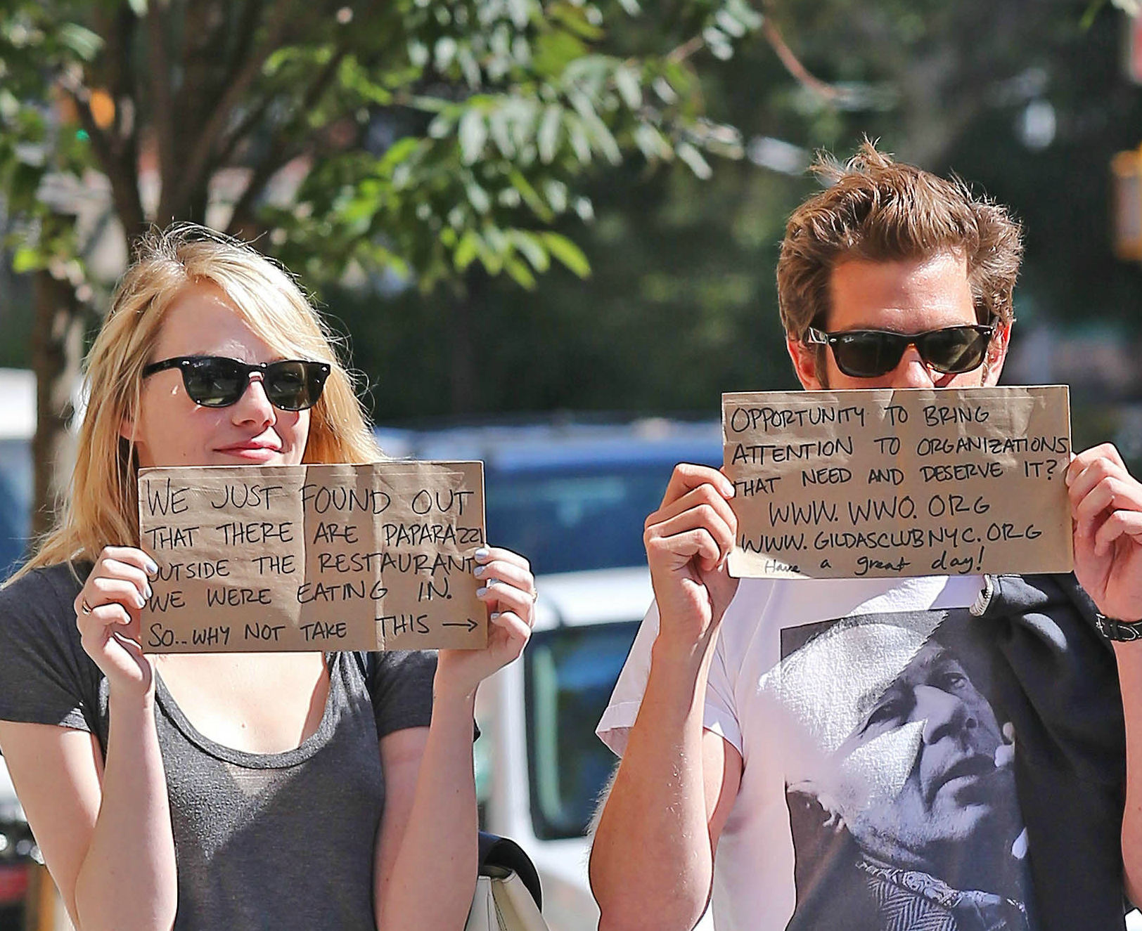 Couple Emma Stone and Andrew Garfield using their celebrity status to draw attention to a good cause after leaving lunch in New York City, New York on September 15, 2012. Emma was holding up a sign that read “We just found out that there are paparazzi outside the restaurant we were eating in, So why no take this…” and Andrew’s sign read “Opportunity to bring attention to organizations that need and deserve it? www.wwo.org and www.gildsclub.org, Have A Great Day!” The two websites they were promoting are Worldwide Orphans Foundation and cancer help at Gilda’s Club.