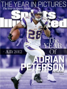 Minnesota Vikings star running back Adrian Peterson, who stands on the verge of breaking the NFL’s single-season rushing record less than a year after major knee surgery, is honored this week by getting his fifth cover of Sports Illustrated.