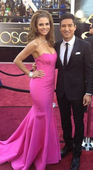 Extra correspondent Maria Menounos looked like Barbie’s kid sister Skipper in a bubble gum pink dress and bouffant hairdo.