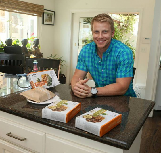 Sean Lowe playing prince charming putting on some shoes provided by Barefooters at The Kia Beach House presented by Sabra.