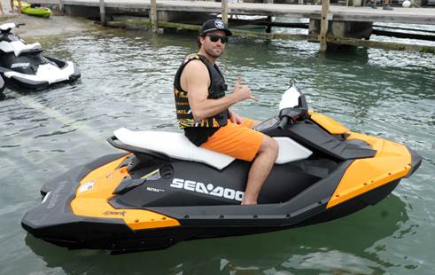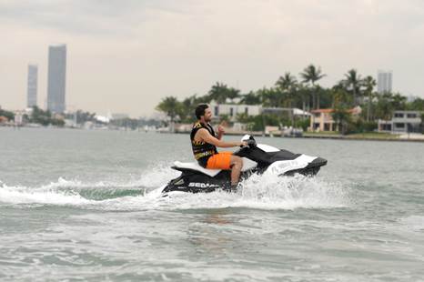 Earlier in the day, Jenner rode the waves in Miami to test ride the new Sea-Doo Spark. Despite the overcast skies, Jenner was all smiles as he did playful accelerations and spins among paddle boarders and luxe yachts in the Miami waters.