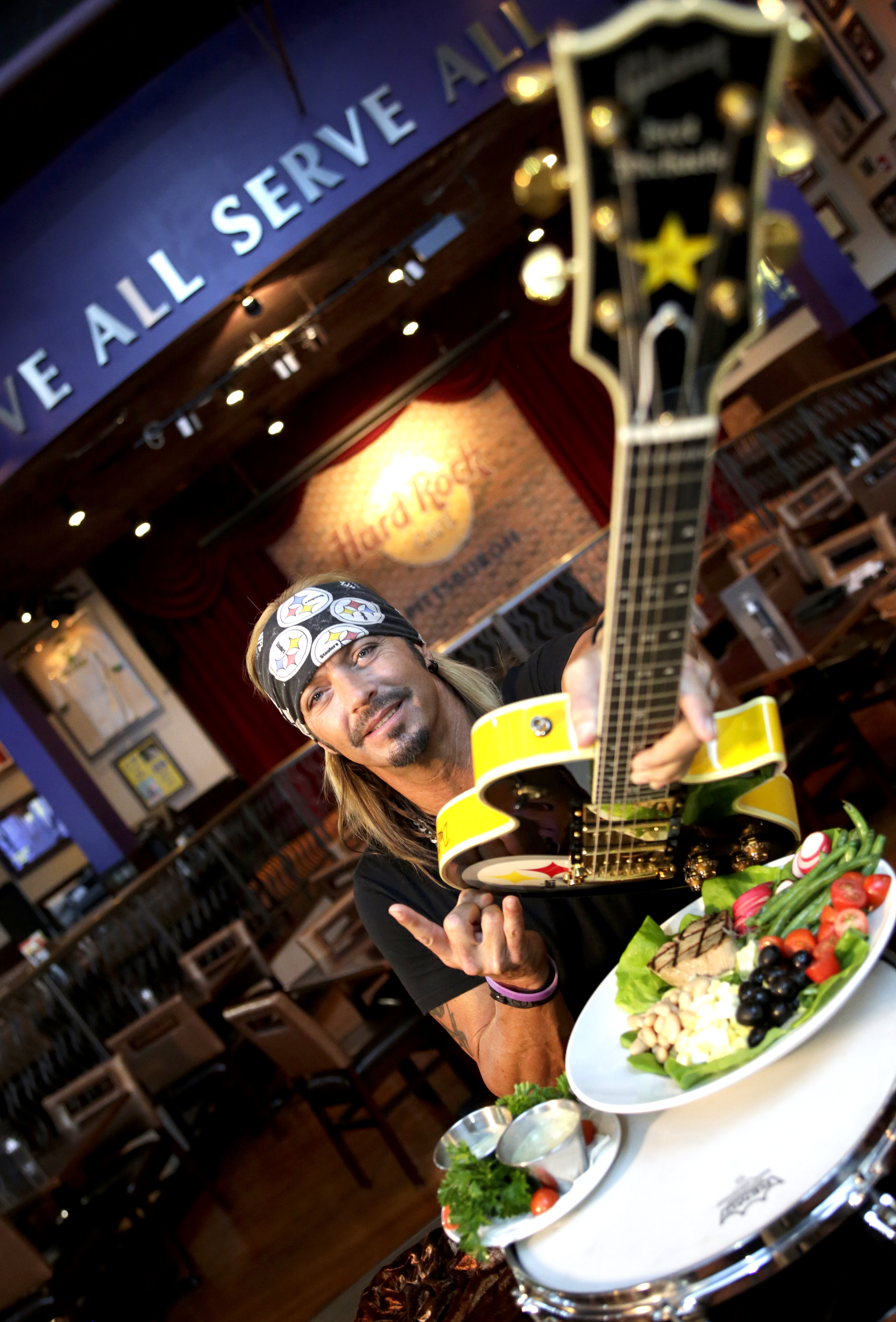 Legendary rocker and Pittsburgh-area native Bret Michaels stops by Hard Rock Cafe Pittsburgh to introduce the new Bret Salad, as well as celebrate his personal guitar donation to Hard Rock’s world-famous memorabilia collection, on Wed., July 2, 2014 in Pittsburgh. (Photo by Ed Rieker/Invision for Hard Rock International/AP Images)