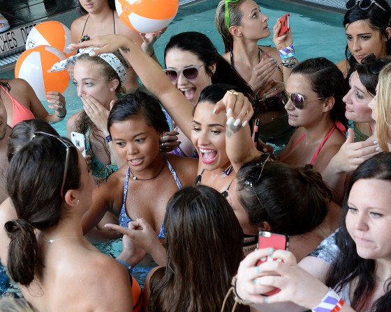 Demi completed her sexy new look with high-waisted jean shorts and a dark indigo jean vest. But after rousing the crowd with an electric performance, Demi slid off her cutoff jean vest and leaped into the pool full of her fans to mingle and snap countless selfies; all while still fully dressed!