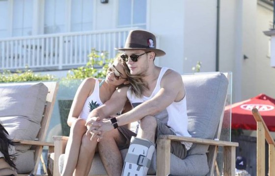 · Sarah Hyland and fellow actor boyfriend Dominic Sherwood came out to celebrate. Sarah carried the bags and helped Dominic down stairs as he was in a leg cast after being hurt doing a stunt on the set of his upcoming show Shadowhunters.
