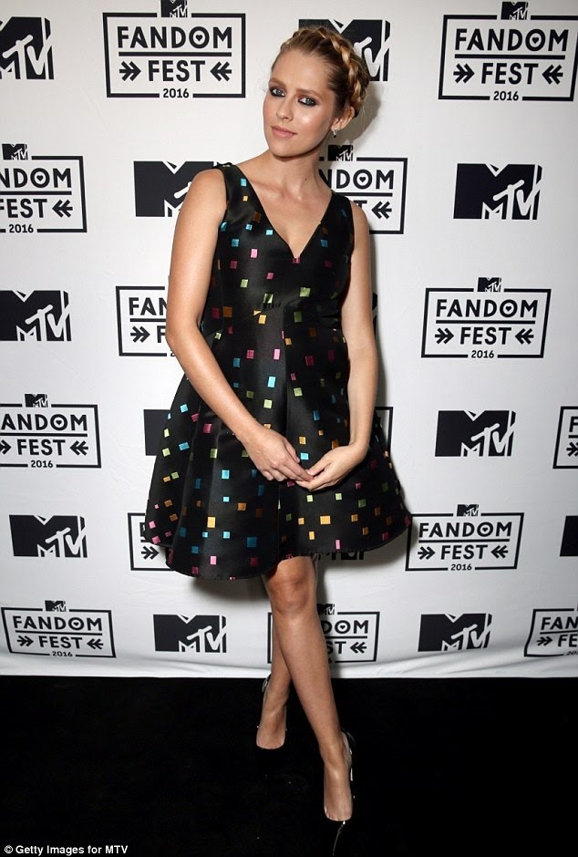 Teresa Palmer wore an Emporio Armani Fall/Winter 2016 black dress with multicolor, square dot detailing to the MTV Fandom Awards 2016 at San Diego Comic-Con on July 21st.