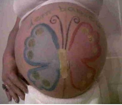 Mariah obviously loves to show off the expansive baby bump because she’s either Tweeting pics of her artistically painted belly, or showing up naked on cover of OK Magazine.